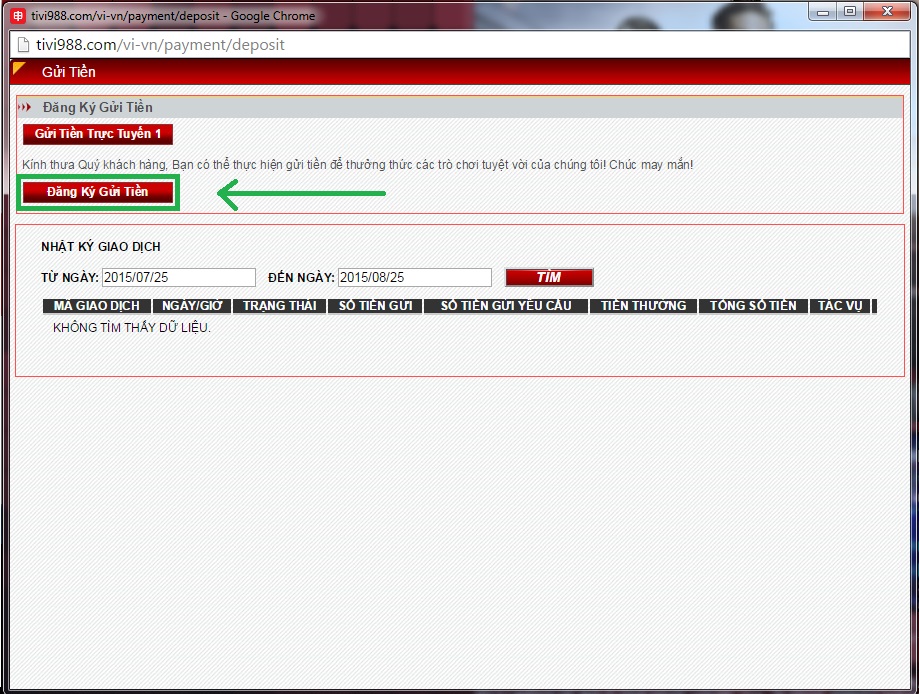 Một cửa sổ mới hiện ra, tiếp tục lựa chọn mục Đăng Ký Gửi Tiền.